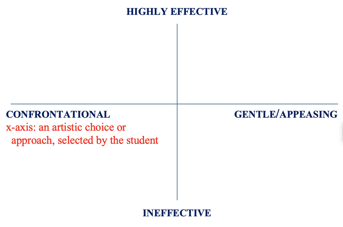 Before drafting a script for their video essay, students develop a matrix, which serves as both an organizing tool and a visual summary of their evaluation of each piece of evidence. Students typically select a variable for the x-axis that tracks an artistic choice or approach, while using the y-axis to depict the work’s effectiveness in raising social consciousness. As I’ve written elsewhere, "By assigning a quantifiable (and entirely subjective) value to each work of art, the matrix serves as a visual snapshot to capture" the student’s core argument and relationship to the artistic works examined in their essay (Udko 2025, para. 37). Embracing the individualized nature of spectatorship, students recognize that there is no right or wrong way to organize their evidence and that they will be making placement decisions that could differ significantly from their peers. One x-axis might measure the optimistic or pessimistic tone of a piece; another might assess the strengths and limitations of departing from realism (e.g., naturalism vs. absurdism). Figure 1 shows one potential iteration of a blank matrix focusing on the confrontational relationships between artists and their audiences.